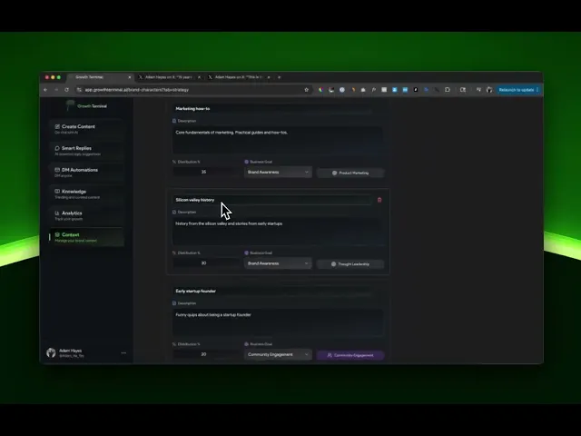 Growth Terminal is your personal assistant coming up with ideas, scouring the timeline, and helping you edit/write high-performing content. After you've set up your account context, we should have a good idea of your branding, who you want to reach, your voice, and some context about what you're doing. We also scrape your last 100 posts so we have a decent idea of how you currently post.
